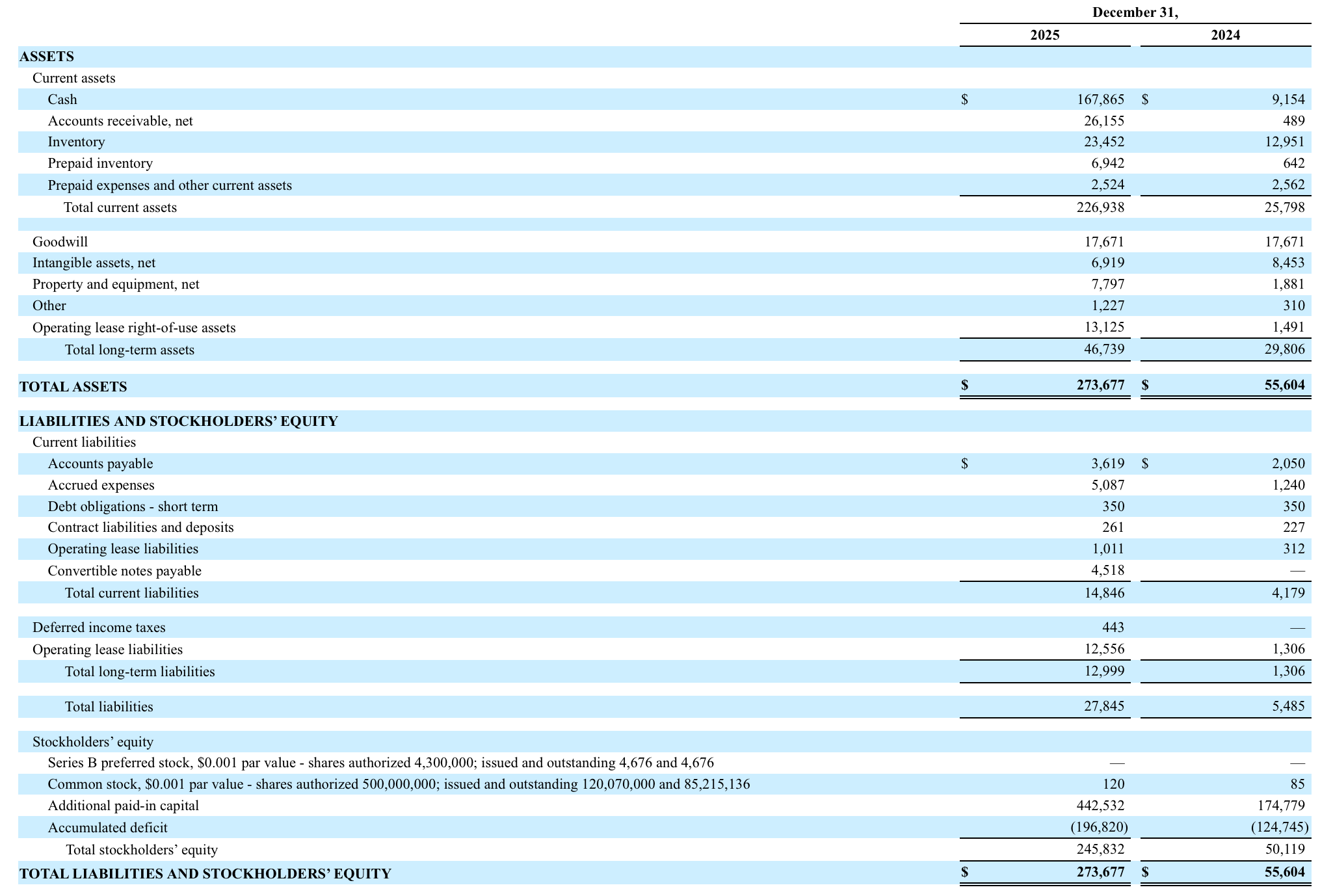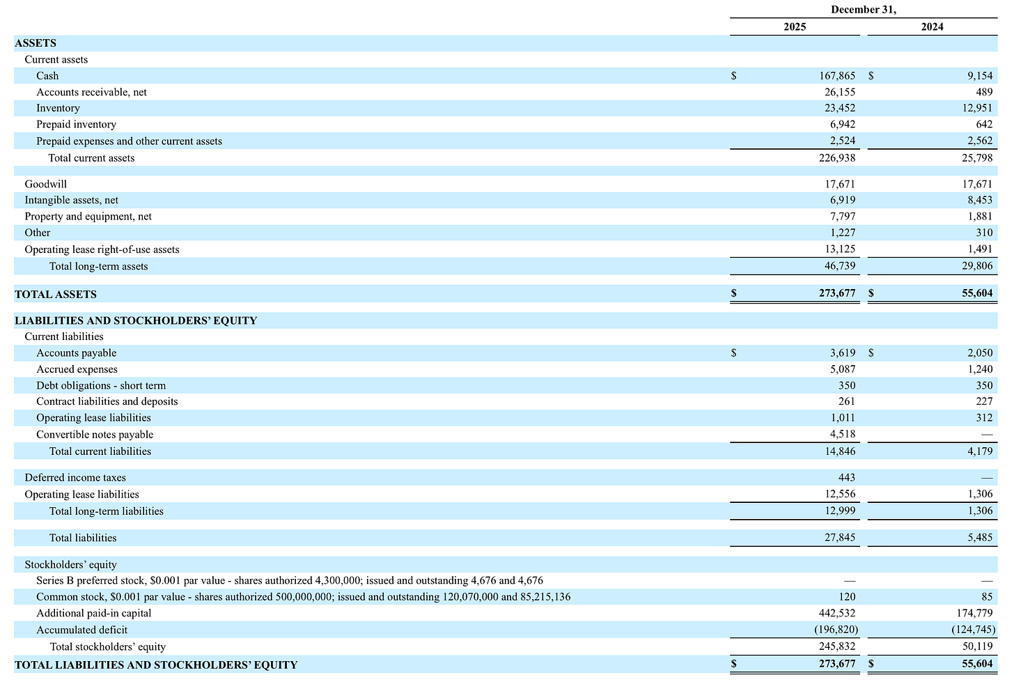 The transformation of the balance sheet over the past year is remarkable. Cash grew from $9.2 million to $167.9 million, primarily driven by a $234 million equity raise and $7.4 million from option/warrant exercises, partially offset by $89 million in operating cash burn and $6.6 million in capex. While the company is clearly burning cash at a significant rate, the war chest provides substantial runway to fund the USV division build-out (estimated at $30-40 million), strategic acquisitions, and inventory investments without needing to return to the capital markets in the near term.
